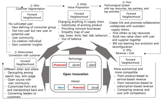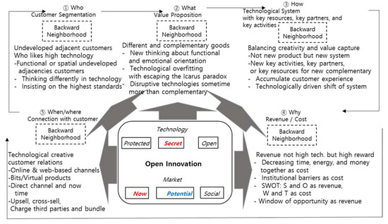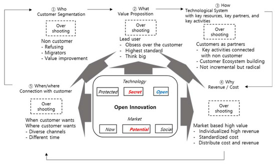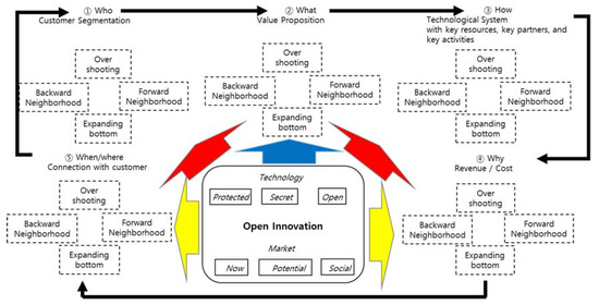 As shown in Figure 3, open innovation in a potential market is critical, and secret or open technology will motivate the overshooting rectangular business model innovation dynamics from “who” (customer segmentation) to “when” and “where” (customer relation and channel).