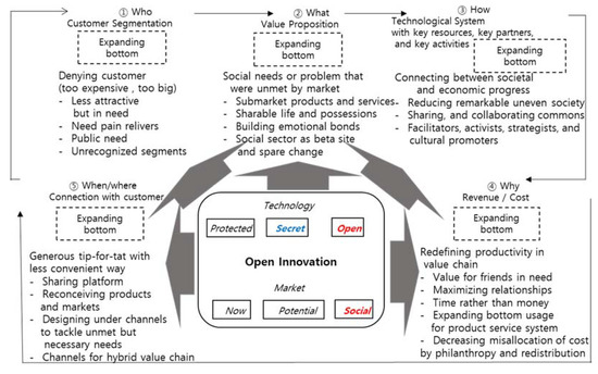 Third, in a social entrepreneur-centered business model innovation, a technological system for connecting social and economic progress is needed to reduce dramatic imbalance in a society, as capital income was significantly greater than labor income in the late 20th century and in the 21st century [50,55,56]. Technological systems as facilitators, activists, strategists, and cultural promoters of sharing and collaborating commons constitute a target of the expanding bottom [57,58].