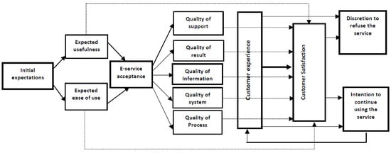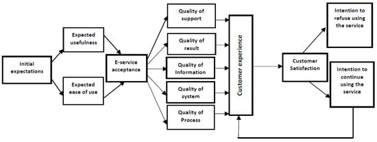 Limitations of technology acceptance and e-service models are rooted in their technological nature and we should apply service-dominant logic [] as a general concept when explaining e-service customer behavior. E-service is a result of value co-creation by the provider and consumer, and thus e-service should be seen as a specific customer experience that creates e-service quality and generates customer satisfaction and intention to continue using the service. Customer experience in e-services has been studied as a factor of repurchase intentions [], firm’s competitiveness [], and word of mouth [], but not in correlation with customer satisfaction and e-service quality. At the same time, the emergence of customer experience of using e-services could explain the transition between customer decision to accept e-services and customer decision to continue to use e-services. It leads to the concept of “experienced” quality, whereby customer perceptions of quality are based on real experience and thus experience influences repurchase intentions through satisfaction. In our view, the combination of e-service quality and technology acceptance models with the concept of customer experience may offer a better understanding of customer behavior, from the decision to adopt an e-service to the decision to continue using this service, with a mediating role of customer experience, e-service quality, and customer satisfaction. Such a combination is also based on the idea of the service journey [].