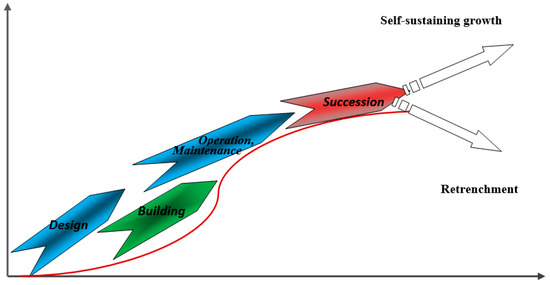 Moore [3] suggests that innovation ecosystems progress through four life cycle phases with distinct characteristics: birth, expansion, leadership, and self-renewal (or death). The authors in this article propose the following ecosystem phases: conceptual design; ecosystem building; operation and maintenance; succession. After succession, there are two possible reactions to the challenges: self-sustaining growth or retrenchment.