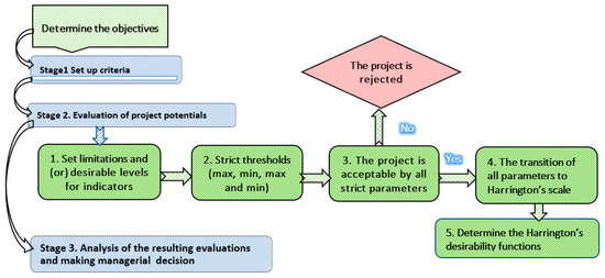 In the context of our study, it is necessary to emphasize the importance of such characteristics of the ecosystem as the complementarity and coordination of enterprises of different industries, united according to the principle of joint specialization. As rightly noted in [28], “the key element of the ecosystem is an innovative project, since the most important indicator of its efficiency is the success of the implemented innovative projects”. The rest of the elements are needed to generate, maintain and develop these projects. Consequently, the innovation ecosystem can be represented “in the form of an area of growth of an innovative project that emerges in this system and then successively goes through all phases of its development” [28]. Of particular difficulty is the implementation of a continuous selection of innovative projects that provide positive synergistic effects from the interaction of participants, and allow the formation of effective sustainable ecosystems [29]. The selection of projects involves an assessment of their potential and must be inseparably linked with the goals and characteristics of the development of the entire ecosystem.