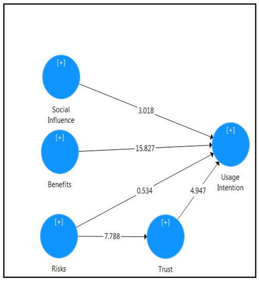 As shown in Table 7, all hypotheses, except H3, are supported. Perceived benefits has a positive and significant relationship to usage intention (β = 0.605; p < 0.05), thus H2 is supported. On the other hand, perceived risk has a non-significant relationship to usage intention; accordingly, H3 is not supported. Meanwhile, perceived risk has a negative and significant relationship to trust (β = −0.378; p < 0.05), therefore, H4 is supported. Furthermore, social influence has a positive significant relationship to usage intention (β = 0.099; p < 0.05), thus, H5 is supported. Finally, trust has a positive and significant relationship to usage intention (β = 0.21; p < 0.05), thus, H1 is supported.