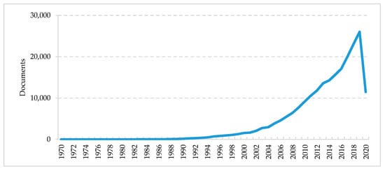 Based on the documents available in the literature on sustainability, 218,458 documents were identified in Scopus between 1970 and 2020, as shown in Figure 1. These results show sustainability represents a current area of knowledge in the literature because the number of publications displays exponential growth over time. It is clarified that for 2020 the documents published until May were covered, therefore, the number of publications compared to 2019 is lower. However, when extrapolating the scientific production of sustainability in 2020 based on the production of the first 5 months of the year, an estimate of 27,566 documents is obtained, surpassing the production of 2019, and corroborating the continuous growth of scientific production related to sustainability.