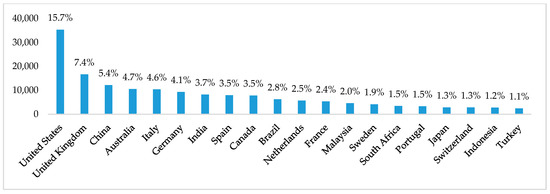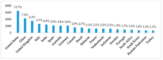Figure 4 illustrates the 20 countries and territories with the largest number of studies related to sustainability, highlighting that the United States, United Kingdom, and China continue as leading countries, contributing 26.8% of the scientific production between 2016 and 2020. When comparing Figure 2 with Figure 4, it is deduced that Italy, India, and Indonesia improved their position in scientific production in the medium term, while Australia, Germany, Canada, South Africa, Portugal, Japan, Turkey, and Switzerland reduced its position compared to other countries and territories. Likewise, South Korea appears in the last 5 years as one of the leading countries in the scientific production of sustainability.