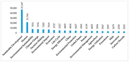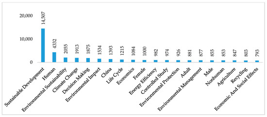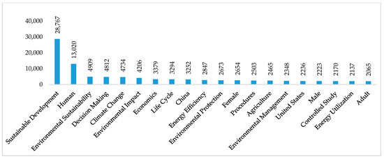 The 20 most relevant research topics between 2016 and 2020 are presented in Figure 5, indicating that sustainable development and humans continue as the leading topics, while decision-making, China, women, procedures, agriculture, and men increased the importance with respect to the results of Figure 3. Likewise, topics like United States and energy use have lost the most relevance when comparing the periods 2011–2020 and 2016–2020. Indeed, topics like innovation and carbon dioxide are no longer among the 20 most relevant topics of sustainability and are replaced by topics such as controlled studies, and adults.