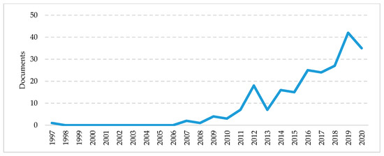 As shown in Figure 8, 227 documents on sustainability and open innovation were identified in Scopus between 1997 and 2020. From the first publication in 1997, it took 10 years (2007) for other documents on this topic to be published, and only until 2013 a considerable increase in the number of published documents appeared. Several documents were published in 2016–2020 (67.4%), and 45.8% of the documents in this topic were published in the short term, between 2019 and 2020. This indicates that sustainability with open innovation represents a topic that has been gaining interest in the recent years.