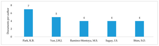 Figure 9 shows the leading authors on sustainability and open innovation, highlighting Park and Yun as the authors with most documents in this topic. These authors have made conceptual models and dynamic systems applied to the macroeconomic, collaborative economy, and electronic commerce fields, all considering some component of sustainability.