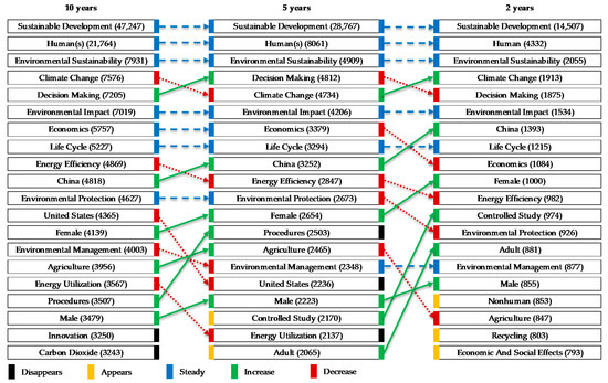 Some topics that have lost relevance over time are United States and Energy Use, which, being respectively in positions twelve and sixteen in the long-term analysis, disappear for the short-term ranking. Likewise, innovation and carbon dioxide remain significant topics in the long term but are not protagonists in the medium and short term, while Controlled Studies and Adults appear like some of the key topics in the medium term, even increasing their relevance for the short term. Finally, in the short term, the topics of Non-human, Recycling, and Economic and social effects appear among the 20 most relevant sustainability topics, creating opportunities for new lines of research in sustainability.