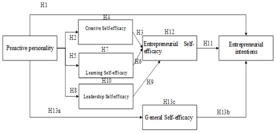 To cite a few, earlier research concluded that self-efficacy acts as a mediator between the association of risk-taking (personality factor) and EI [12]. Some others claimed that self-efficacy partially mediates between the connection of individual characteristics and EI [39]. Another study empirically proved in a sample of business university students that self-efficacy acts as a mediator between the association of PP and EI [23]. Additionally, it has been declared that self-efficacy fully mediates between EI and PP linkage [63,64]. Assuming self-efficacy as a motivational phenomenon [58] and the continuing debate on whether self-efficacy partially or fully mediates between the EI and PP relationship following hypothesis is established.