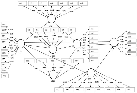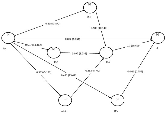 Underpinned with social cognitive theory, people cognitively find the ways through which they are likely to chase rigorous entrepreneurial activities. Potential entrepreneurs may test assumptions, utilize previous experience, predict various features of successively doing business, and attempt to explore hidden obstacles to establish a new business. Cognitive thinking of the dominion of entrepreneurship also embraces the scanning environment, judging, and cognitively building entrepreneurial prospects [40]. In view of a social cognitive paradigm, the more one has confidence in his talent to efficaciously perform the responsibilities and job of an entrepreneur the more likely he will endeavor to become an entrepreneur [12]. Thus, one having a greater sense of ESE has more chances to select the entrepreneurial setting than others with a lower level of ESE. Thus, the model represented in Figure 1 shows that PP affects EI through mediating the intervening play of broader self-efficacy beliefs, general self-efficacy, and specific self-efficacy beliefs.