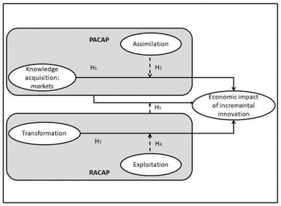According to [28] proposal, absorptive capacity is a sequential set of routines grouped into two factors—PACAP and RACAP. Thus, although PACAP focuses on the analysis and understanding of external knowledge, RACAP focuses its greatest attention on the combination and integration of new knowledge into the base of those previously accumulated in the company as well as its incorporation into the company’s activities. Thus, PACAP has traditionally been associated with radical innovations through the acquisition and assimilation of heterogeneous knowledge [43], while the development of RACAP would require a culture that fosters stability and control in the transformation and exploitation of new knowledge [25,44] and, therefore, more in line with obtaining incremental innovations [45]. Moreover, as it is developed through more formalized routines, it is more predictable in terms of later returns [15].
