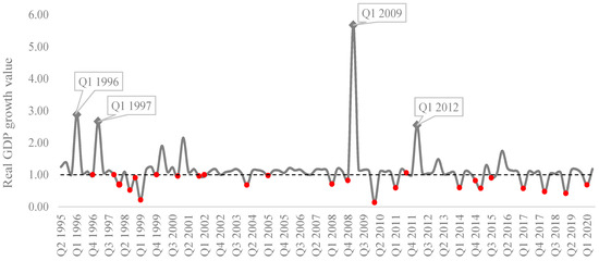 Initial verification of the data by the Kolmogorov-Smirnov and Shapiro-Wilk tests in Statistica 10.0 program showed that the normal distribution law is refuted with a probability of p < 0.01 (according to the Kolmogorov-Smirnov test) and of p = 0.00000 (according to the Shapiro-Wilk test). To bring the data to the normal distribution law, extreme values were gradually eliminated (in proportion to the decrease in the real GDP index deviation for the appropriate quarter from the average value from 1995 to the first half of 2020). The elimination of extreme values continued until the real GDP index variable was brought to the normal distribution law. This method of bringing data to the normal distribution law is confirmed by research [56,57]. As a result, the following points shown in Figure 1 were excluded: Q1 2009, Q1 1996, Q1 1997 and Q1 2012.