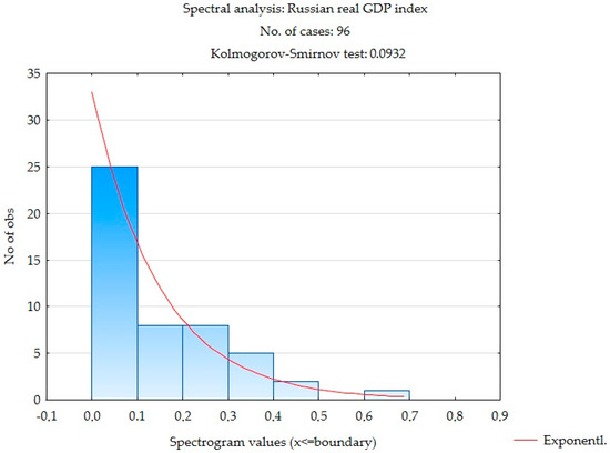 The Kolmogorov-Smirnov test was used to check the statistical significance of potentially possible cycles (Figure 2). This test helped verify the exponential law of the periodogram value distribution for the Russian real GDP growth rate for the period from 1995 to the first half of 2020.
