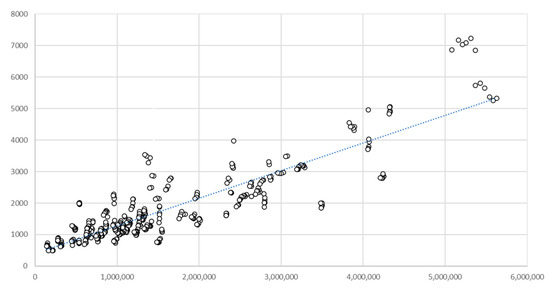 Figure 2) allows us to estimate a trend line—the efficient frontier of the number of civil servants in the regional executive authorities with respect to population. Several conclusions can be drawn: if a region is below the trend line, one can assume that the potential for growth in the number of civil servants has not yet been depleted, and if it is above the trend line, the number of civil servants in regional executive authorities is relatively excessive.