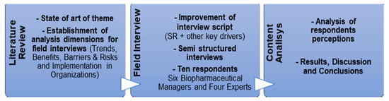 The elaborated methodology is exhibited in Figure 2, and further detailed as follows. The study builds on a preliminary review of the literature addressing the main scientific databases and specialized journals in the areas of health, drug production and management of biopharmaceutical companies. The search results returned very few relevant studies addressing the theme of I4.0 in the specific context of biopharmaceutical industry. In total 8 were identified via the traditional scientific bases—Emerald, Scopus and Science Direct—and 35 other manuscripts in specialized journals in the field. Despite the scarcity of specialized literature in this business sector, the analysis allowed for the identification of I4.0 dimensions that supported the subsequent research work, notably the field interviews that were conducted.