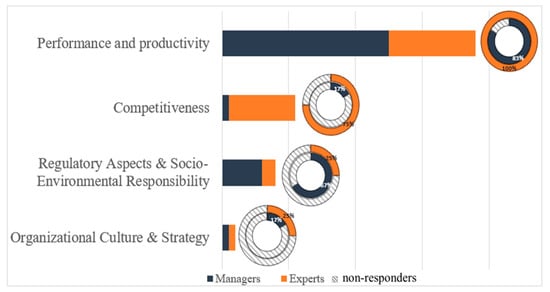 The benefits related to the “Performance and Productivity” dimension were the most frequently cited by both categories of respondents (Area Managers and Experts). This dimension concerns the gains related to the improvement of production processes in biopharmaceutical organizations. Most noteworthy are aspects related to the improvement in operational efficiency, increased productivity, reducing bureaucracy (replacing paper records with digitized ones) and the setup of flexible production lines.