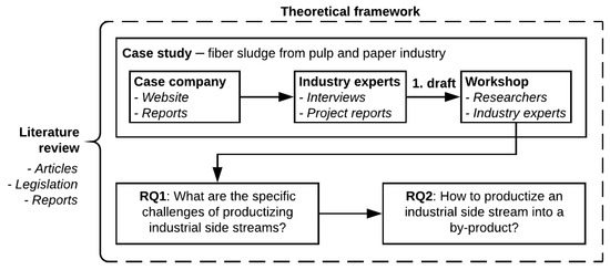 The productization of industrial side streams was studied via a descriptive, in-depth case study [52]. Figure 1 illustrates the research process and the utilized research methods. The study was initiated by creating a theoretical framework based on a thorough literature review on productization, industrial side streams and by-products and circular economy concepts, as well as on the related legislation, to which later empirical studies could be compared to. The empirical data collection included first an analysis of the case company’s public documentation on the production and side streams. Then, an interview with a case company presentative was conducted where the current state of case side stream production and utilization were discussed, followed by an interview with a researcher studying pulp and paper industry side streams who also had studied the possibility to utilize the case side stream as a raw material for a dust-binding agent. Interviews were semi-structured and the research questions were based on the conducted literature review and experiences from earlier circular economy projects. Lastly, a workshop session was organized with eight researchers and industry experts, including the researchers conducting the study. In the workshop, the practical limitations and other challenges of case side stream utilization were analyzed, and the business potential of the business case draft proposed by the researchers was evaluated from both the side stream producer’s and user’s perspectives. The information available on the website and reports of the case company, as well as project reports and other documentation from earlier research and development projects regarding the case company and projects regarding similar circular economy subjects, were utilized in drafting the productization of the case side stream. These reports included a great example of using open innovation to find new industrial side stream utilization possibilities as the case side stream was one of the case materials given to students in a circular economy innovation contest, where teams were assigned the task of creating a new business from currently underutilized local industrial side streams in cooperation with case companies and researchers. Finally, based on the feedback from the workshop session, a conclusion was drawn about how to productize the case company’s potential side stream for commercial use and to answer set research questions based on the results of the case study and conducted literature review.