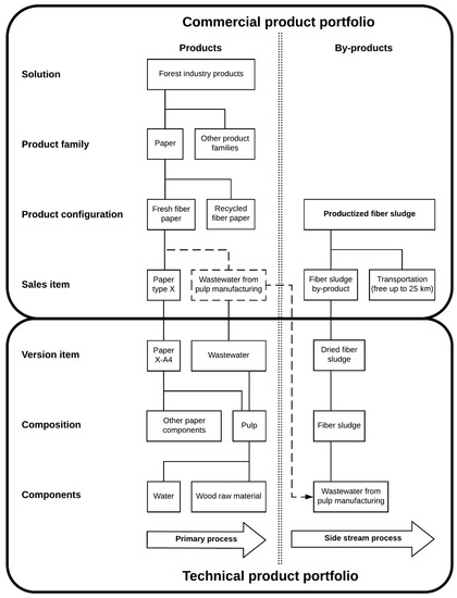 The product portfolio of Stora Enso Oulu with respect to aspects essential to productization of fiber sludge. Wastewater from primary process is an input to side stream process and as such is marked as a sales item of the primary process. If the side stream process were to be operated by another company—for example, subsidiary of Stora Enso Oulu—wastewater would actually be sold as a sales item.