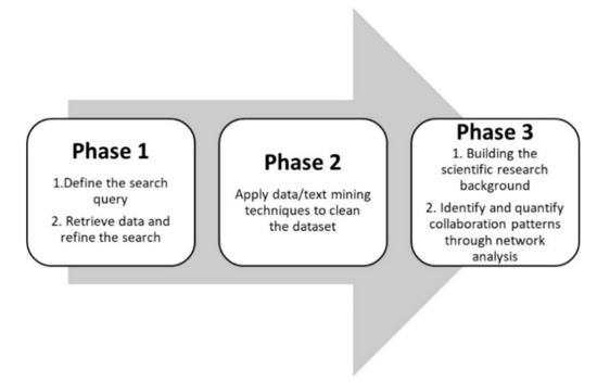 Various methods or techniques can be used to review the scientific literature [46]. In this case, a bibliometric and network analysis is chosen to achieve the objective of the work: to analyze the OI paradigm from a knowledge transfer or knowledge sharing perspective. These techniques are of value to assess the current state, identify strategic relationships and predict development trends [28,35]. To this end, the proposed methodology consists of three phases described below (see Figure 1). These phases will make it possible to identify and quantify, on the one hand, academic performance (trends, authors, countries, organizations...) along with the main research subareas and, on the other hand, the main collaboration networks and the conceptual framework of topics, thus satisfying the established objective. However, the aim of this research practice is that it can be applied to any type of emerging field of scientific research.