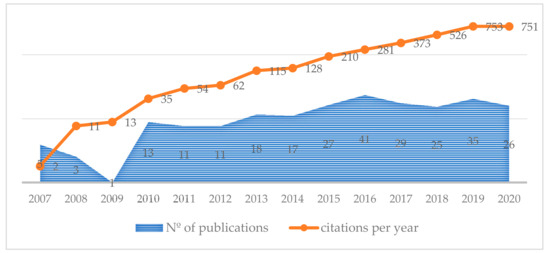 The progress of publications and citations is represented in Figure 2. Since 2010, the number of publications has remained constant, with an average of 21 articles per year; the year 2016 prominent for having 41 publications. It is true that the first publication identified is from the year 2007, having only five records, and the topic loses interest in the next two years, but in 2010 it is again of interest to the scientific community. However, the number of citations per year rapidly augmented from 2010, and by 2020 (751) this was over twelve times higher than in 2012 (62). Hence, the science research community is focusing its attention on concepts related to the approach of knowledge management in the OI model.