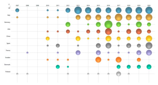 In addition, the UK, Italy and Finland are highlighted as pioneers in scientific research (with regards to the 2007 start date). With the exception of Finland, they have developed steady scientific production, and they have grown progressively over time. Production in China and the USA, despite being the fourth and fifth countries with most publications, began to be relevant in 2010 but without constant growth in recent years.