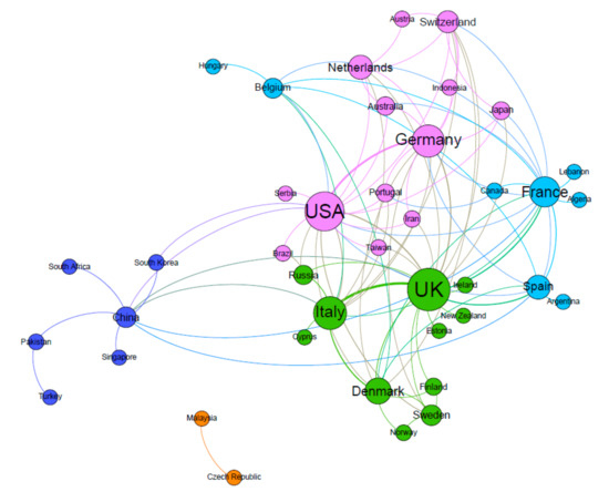 A network analysis has made it possible to identify and quantify the collaborative activities between the different countries. Gephi software has modeled the co-occurrence network created in VP, mapping the countries that have at least one collaboration (see Figure 4). In addition, the node size represents the weighted degree, which indicates the number of connections (edges) that a node has with other nodes, but weighted by the thickness of each edge. Consequently, the country most active in academic collaborations in the research field is the UK. In the cluster led by the UK, mainly European countries are collaborating, including Russia and New Zealand. The second cluster is led by France, Spain and Belgium, with collaborations grouped with Argentina, Lebanon, Canada and Algeria (Asia and America). As far as the USA-related cluster is concerned, collaboration is mainly with Germany, Netherlands, Switzerland and Portugal. China, as the main node, forms another cluster, mainly with Asian countries, such as South Korea, Singapore and Pakistan.