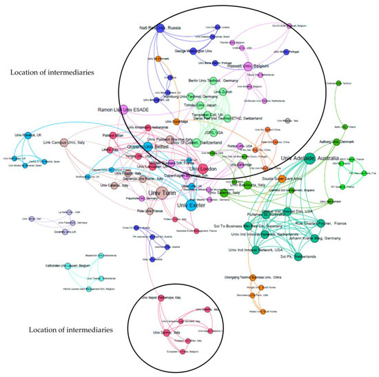 Table 4 shows the results of the network analysis, identifying the most collaborative organizations (Weighted Degree), and at the same time, those that play an important role as intermediaries of other organizations that have no direct connection (Betweenness Centrality) and their influence (Closeness Centrality). Except for the University St. Gallen (Switzerland) (2 publications), the results indicate that the most productive countries are the ones that collaborate the most. However, if we analyze the organizations that play an important role as intermediaries for other organizations that do not have direct contact with each other, the results change. Figure 5 shows where the main intermediary organizations are located in the network. Copenhagen Business School (three publications) is the one with the highest betweenness centrality, providing the most help for contact between non-linked organizations, but a medium-low influence on other organizations, according to its value of closeness centrality (0.3838). The University of Turin, besides being a productive and collaborative organization, plays an important role as an intermediary, with influence on other universities. The University of Adelaide, despite being very collaborative, does not play a significant role as an intermediary, suggesting that everything it has developed has been done with the same research group (as far as organizations are concerned). The University of Birmingham and the University of Naples Parthenope, although not very productive, do play an important role as intermediaries.