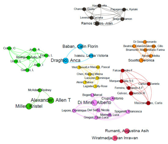 An interesting method to gauge scientific collaboration is the analysis of co-authorship networks. Based on the matrix of authors’ co-occurrences, the layout of the network is generated and mapped using Gephi software. Figure 6 shows the most collaborative research groups. The network has a high modularity (0.988) which indicates that many clusters are formed and, in this case, there is no collaboration between the different research groups (each group forms a cluster). The most collaborative authors according to the calculation of their weighted degree are Alexander, A.T. (17), Miller, K. (16) and Di Minin, A. (15) and the research groups formed by Draghici and Baban (15 and 13) and Rumanti and Wiratmadja (12). It should be noted that Di Minin, A. is the author who has the strongest role as an intermediary (betweenness centrality: 62.33), and Ramos Castro, J. who, despite having only two publications, is a collaborative author and intermediary over other actors.