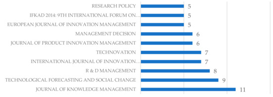 Analyzing the sources of diffusion of publications makes it possible to identify the journals most related to the subject important for the producer (authors), and at the same time, allow the publishers to determine relevant information to guide their positioning strategy. The search has been done in Journals, Conference proceedings and Books, with 66% of publications published in Journals and 30% in Conference Proceedings. According to Journals, the most important sources of diffusion are linked to areas of innovation and management. The 272 documents were published in 170 different sources; therefore, there are many sources of diffusion. The main journals are ‘Journal of Knowledge Management’, ‘Technology Forecasting and Social Change’, ‘R&D Management’, ‘International Journal of Innovation Management’ and ‘Technovation’, all having more than six articles (15.5%) (see Figure 7).