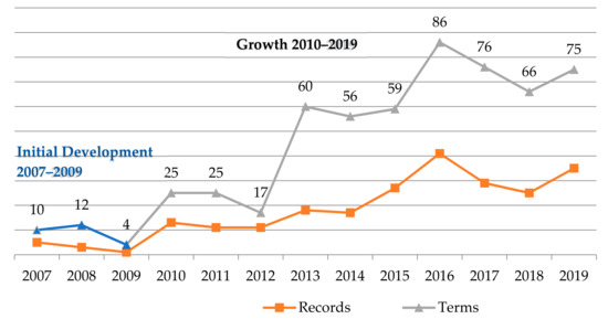 Author keywords analysis provides an insight into research trends, helping to identify areas of interest to the scientific community related to knowledge sharing or transfer in an open innovation context. Using VP software, 655 author keywords were obtained from 272 publications. In addition, the analysis of the first year in which a keyword in an obtained dataset appears allows the maturity level of the research field to be measured. In this case, as shown in Figure 8, there are two phases in its scientific evolution. On the one hand, the initial development phase is identified between the years 2007–2009, during which hardly any new knowledge terms are generated. On the other hand, between 2010 and 2019 new terms are generated above the scientific production, producing a science growth phase. The year 2020 has not been considered in this analysis because it may not be truly representative or objective as the year has not ended.