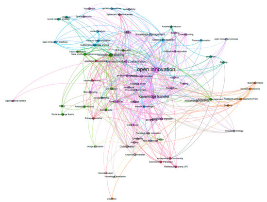 To better evaluate the network, quantification of author’s keyword values is represented in Table 8 based on their betweenness centrality measure. Its analysis and comparison with Table 7 allows us to observe that terms such as “Communication”, “Inter-organizational context”, “Open innovation practices”, “education”, “Innovation strategy”, “Start-up”, “Process innovation”, “Sustainability” and “Knowledge creation” gain relevance and become important bridge nodes. However, “Tacit knowledge”, “Governance” and “Industry” lose relevance, but are still important research topics.