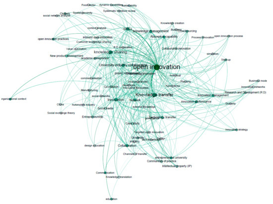 The level of maturity of a technology could be estimated using a growth curve method [67]. In this case, the extraction of the new terms by year allows the maturity level of the curve to be analyzed, concluding that research into the relationship between OI and knowledge transfer and knowledge sharing concept has been growing since 2010. The network is focused around the term ‘Open Innovation’, establishing a research environment that brings together terms with more weight by way of collaboration and in terms of their behavior as intermediary nodes, such as ‘Knowledge transfer’, ‘SMEs’, ‘University-Industry collaboration’ and ‘Innovation’. The other term of interest for the ‘Knowledge sharing’ study is grouped with a scientific environment that studies ‘Co-creation’, ‘R&D cooperation’, ‘New product development’ and, curiously, an ‘Automobile industry’ sector. These nodes will define a near future in terms of research paths related to knowledge transfer in OI context. The study also shows that new research nodes, less conventional than previous ones, are opening the way to become study references, such as ‘Communication’, ‘Inter-organizational context’, ‘Open innovation practices’, ‘Education’, ‘Innovation strategy, ‘Start-up’, ‘Process innovation’, ‘Sustainability’ and ‘Knowledge creation’.