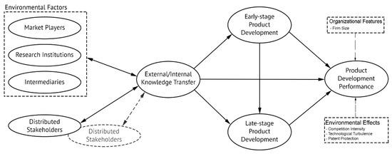 Pateli and Lioukas [8] have developed a holistic multi-mediation model which focuses on both collaboration with stakeholders (environmental factors) including market players, research institutions and intermediaries as well as stages of collaboration highlighting the effect of external knowledge transfer on functional involvement in the early and late stages of innovation leading to innovation performance. This framework includes organizational features as factors (e.g., firm size) and environmental effects such as competition, turbulence and patents, which have an impact on the overall performance. One important aspect of this framework is the process of information flow from start to end. The emphasis is on how the external knowledge links with the earlier and later development stages, showing that the external knowledge transfer is critical throughout the process to realize innovation performance.