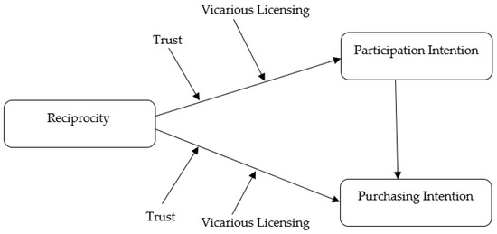 This study also identifies other variables, such as trust and vicarious licensing, which could affect the strength of the relationship between consumers’ patronage behavior and reciprocity. Firstly, we have discussed the effect of trust on the strength of the relationship. Results shown in Table 7 and Table 8 tell us that trust increases the strength of the relation within reciprocity and patronage behavior. This is in line with the findings by Park [11], and Forehand and Grier [32]. They stated that philanthropic activities conducted by a company will generate more results if the consumer places trust in a company. Finally, this study also identified that vicarious licensing decreased the obligation of the consumer to return kindness. Consequently, the effect of reciprocity on consumers’ patronage behavior will decrease, i.e., both participation intention and purchasing intention as shown in Table 9 and Table 10. The same proposition was made by Kouchaki [36] in his research: The effect of licensing is not restricted to an individual’s own performance. When a person sees others behaving more ethically on his behalf, this will lead a customer to behave less ethically.