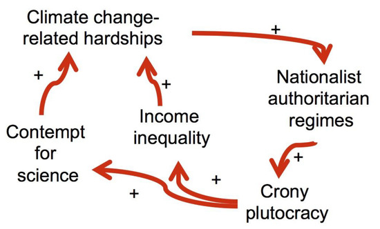 Inequalities in income and wealth have left many US families “one medical emergency away from poverty”, even as the super-rich class is further enriched. Figure 1 shows the systemic connections among environmental problems, authoritarian government, inequality, and attitudes toward science. The plus signs (+) in the Figure indicate that the more that happens at the arrow’s tail, the more will happen at the arrow’s head. The entire picture demonstrates a vicious cycle.