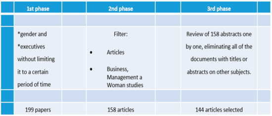 This investigation began in June 2018. A first search was made of the main collection of Web of Science (WOS). The word search included the terms *gender and *executives without limiting it to a certain period of time. Only scientific articles were taken into account, discarding any other type of publication. Those journals indexed in listings, such as Journal Citation Reports (JCR), Scimago Journal & Country Rank (SJR), and Scopus, were considered. In addition, it was refined by three main categories: Business, Management, and Woman Studies. That search gave us a result of 199 articles with which we began to work.