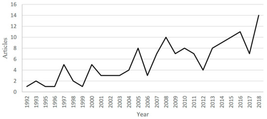 Temporal evolution of the analyzed production is increasing, as can be seen in Figure 2. From 1992 to 2018, the number of articles per year has suffered significant ups and downs, although, if the trend line is traced, it progresses steadily. Thus, the first article was registered during 1992, ending in 2018, with 14 articles. It is necessary to emphasize peaks in the ascending line as those of the year 1997 with five articles or 2008 with 10 articles. Descending peaks included one article in 1999, three articles in 2006, four articles in 2012, and seven articles in 2017. There has been a sharp change between 2017 and 2018, as the number of articles on “Executives and Gender” has doubled.