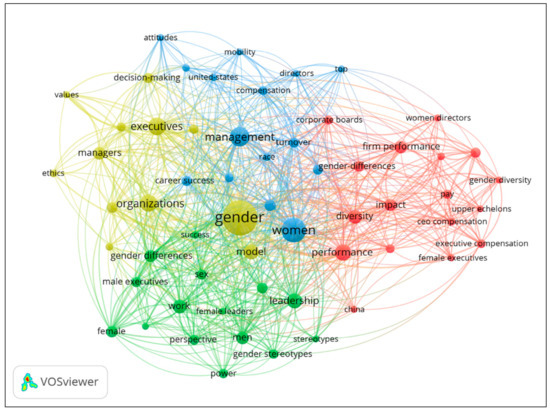 In addition, the VOSviewer software allows for the representation of the conceptual structure of a research field while using bibliometric maps. Because of the multidisciplinary character in which the theme “Executives and Gender” can be found, such a representation improves the global understanding of the object under investigation.