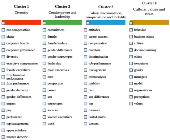 Figure 4 has been elaborated in order to better clarify the relationship of all the selected keywords, where the color assigned to each cluster has been specified with the intention of being able to appreciate the themes that intertwine with each other, giving rise to a relationship of concepts that point us to a series of ideas on which we are researching. Thus, cluster 1 focuses on research regarding diversity and its impact on corporations, cluster 2 is more oriented to research about power and gender leadership in organizations, while cluster 3 is involved in issues of wage discrimination, compensation, and mobility within organizations, and, finally, cluster 4 is focused on issues related to cultural, value or ethical aspects.