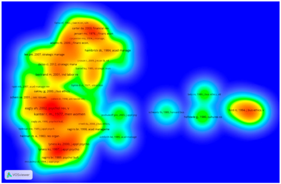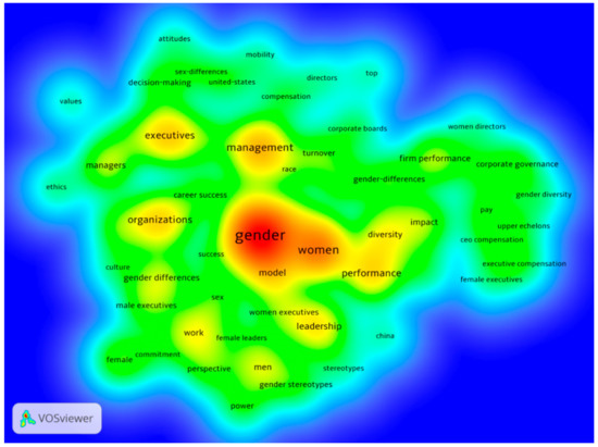 The VOSviewer software also allows for seeing the density of the groups (Figure 5) through a bibliometric density map, in which each node is represented by a scale of colors that reveals the density of the relationships between the keywords (the colors close to red show the areas with the highest density of co-occurrences of keywords and the colors close to yellow and green show the areas with the lowest density of co-occurrences of keywords). The density of a point on a map depends on both the number of neighboring items and the weights of these items. The greater the number of neighboring elements and the smaller the distance between these elements and the point of interest, the greater the density of the element. In addition, the greater the weight of neighboring elements, the greater the density of the elements [29]. Thus, in the central area of the map (red color), due to their significant centrality and co-occurrence, the keywords belonging to the consolidated lines of research, such as “gender” and “women”, are located. A group with greater density corresponds with a greater weight and a greater number of co-occurrences within the group.