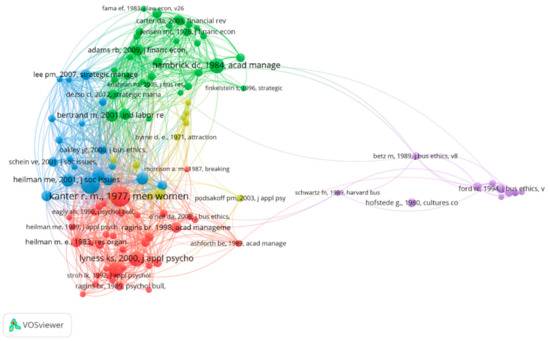 As for cluster 1, authors, such as [24,33,34] and other authors, have focused on the career and barrier posed by the classic “glass ceiling” theme, as well as the concept of “glass cliff” according to [35]. With respect to cluster 2, the central theme of the work is related to gender diversity on corporate boards and strategies for performance improvement, and how this diversity influences the results, both of the organization and the organizational structure itself ([36,37,38]. On the other hand, there are works, such as [39], which have focused on the wage gap. In cluster 3, research has generally focused on issues that are related to gender and leadership. Some authors, such as [40], not one of the most active, study the difficulty that women have to become leaders and achieve success with that role or the comparison of effectiveness and leadership between men and women. The case of [41] relates the scarcity of women at the top levels of organizations to gender bias in evaluations. The most prominent content in cluster 4 focuses on research regarding behavioral psychology ([42,43]; or, about inequality in women’s organizational mobility and distribution ([44,45]. Finally, in cluster 5, the works focus primarily on gender and ethics, as well as on issues, such as decision-making and the difference between men and women in ethical behavior ([45,46,47,48]) or cultural aspects [49]).