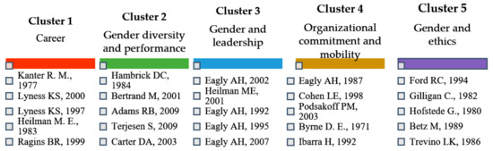 Once the classification of the clusters resulting from the analysis of co-cites by references has been carried out, the different study tendencies in each of them become evident. The following themes are drawn: career, gender diversity and performance, gender and leadership, organizational behavior and mobility, and gender and ethics (Figure 7).
