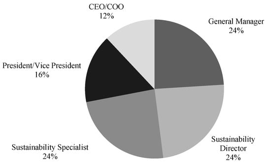 As far as interview participants are concerned, the sample represents the process of selecting the number of subjects participating in a study []. In general, the number of participants was small, as socially significant subjects were chosen because the concern as a researcher is to develop a rich and dense description of the phenomenon under study []. Due to the exploratory nature of this study, we followed a non-probabilistic purposive sampling. The obtained sample presented the following characteristics. 16 were male and nine were female. Regarding the years of experience, 8% had between 0 and 10 years, 48% between 10 and 20 years, 12% had between 20 and 30 years of experience and finally, 32% had between 30 and 40 years. We interviewed people who already had some years of experience, allowing us to contact professionals who had been involved in different contexts and situations and could add content and value to the research. Regarding the professional position, we classified the interviewees according to five different categories: President/Vice President, CEO/COO, General Manager, Sustainability Director, and Sustainability Specialist. It is possible to see from Figure 1 that about 48% of the interviewees held positions directly related to sustainability; however, the other 52% holding administrative and decision-making positions were also able to talk about any subject since they are the main ones responsible for any decision related to the company.