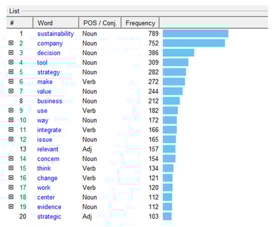 The first tools used to analyze the content of the interviews were the Word Frequency List and the Word Cloud allowing us to visualize the words that were most frequent during the interviews and thus draw some relevant conclusions. As previously mentioned, text mining was conducted as a form of qualitative analysis, to obtain from all interviews the most relevant information to be analyzed and discussed as stated by Goswami and Shishodia [].