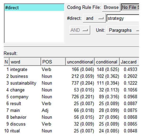 It was practically universal for all the interviewees that strategy is an indispensable mean to reach the expected results and objectives and, in this way, to guarantee a good functioning of their companies in obtaining a competitive advantage in their business environment. This proves what Michael Porter stated many years ago, that any company that wants to reach success has to have a well-structured and defined strategy in three basic pillars in order to create a competitive advantage over its competitors []. So, it is easy to understand why words such as business, company, results, and behaviors are well associated with strategy. Besides this, the word sustainability and integrate were among the most associated with strategy and this means something because more managers and directors of companies are realizing that it is inevitable to choose the path of sustainability and that it is necessary to change the way of thinking and acting on the market, for this sustainability must be integrated as a fundamental theme in the strategy of any company. Like Chung et al. [] mentioned, companies that do not realize this quickly will end up suffering the consequences of their decisions because the market is increasingly complex and volatile, resources are becoming scarce, competition is increasing, and as such, it is necessary to change the capitalist mindset to generate profit at all costs, even if compromising the future of the company in the long term and begin to choose other paths.