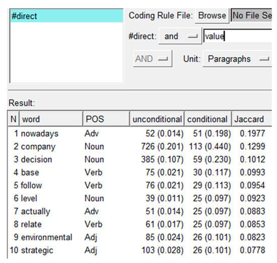 The second method used in text mining was Word Association. This qualitative methodology is widely used in specific research areas and investigations such as psychology and sociology [,]. This methodology is based on inferring which words are most often associated with each other to understand the concepts and themes most relevant to the interviewees that should be studied []. In total, four of the most debated words and concepts during the interviews were chosen as objects of analysis.