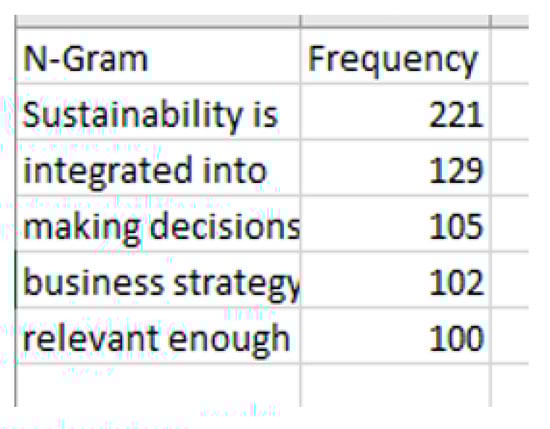 Finally, it is also worth mentioning another three words that stand out in this cloud of words. One of them is opportunity—for most of the interviewees, this is a keyword that demonstrates how sustainability should be faced. It is easy to realize that for many of the respondents, this is still a concept seen as an obligation and not as an opportunity and this mentality has to change quickly []. The other two words are relevance and evidence—many of the answers obtained addressed the importance and relevance that sustainability has for the company, responding that this is a very important issue in the strategy and that there are concrete measures that prove it. However, when we look for evidence, in some cases, this does not happen, which shows that there is still a great difficulty for companies to choose the path of sustainability over the easier path that is to try to make a profit at any cost, without thinking about the future of the company in the long term [].