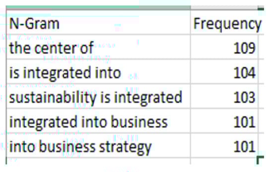 One of the most used text mining techniques is bigrams and trigrams. This happens because multi-word features can provide information that is sometimes more relevant and efficient to obtain objective conclusions than analyze single words that are isolated and often challenging to understand the context []. When analyzing a bigram or trigram, it is normal to find phrases with articles or pronouns in the most frequent ones, however, in this data analysis in the case of bigrams, these stop words were excluded to analyze the ones with more relevance. Figure 9 and Figure 10 shows the resulting bigrams and trigrams for this research.