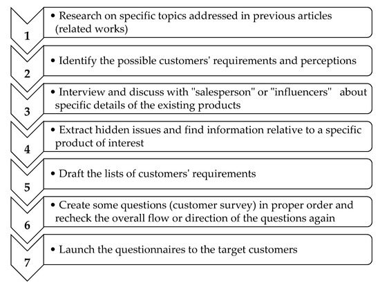 To identify customer requirements, seven steps are necessary (Figure 5). Self-administered questionnaires (SAQs) are created and distributed to the target customers. This type of questionnaire is designed specifically to be completed by a respondent without the intervention of the researchers (e.g., an interviewer). However, the researchers might need to review the market status where similar products (existing ones) are in competition. These considerations include the characteristics (i.e., form, fit, and function) and costs of the existing product, and customers’ perceptions of those products. Then, the data obtained from customers are translated into an engineering design platform where the shape, color, and size are used as key components for creating a conceptual model.
