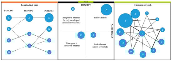 In order to represent the evolution of literature, we used longitudinal maps (Figure 1, left). These allow us to observe which themes have been formed in the previously established periods and what their evolution has been over time. To observe the role played by a theme in the field of research, we used strategic maps. These are divided into four quadrants (Figure 1, centre): (A) the driving themes, which symbolise the themes that lead the speciality, are well developed and important for the construction of the scientific field, (B) the basic themes, which are important for the scientific field but are not sufficiently developed, (C) the emerging or decadent themes, which are very underdeveloped and marginal, and (D) the peripheral themes, which are characterised by being very specialised. Finally, from each cluster or main theme that appears in the above maps, a network or network is formed, which is called a thematic network (Figure 1, right). This is formed through the interconnection of keywords based on the documents associated with each theme.